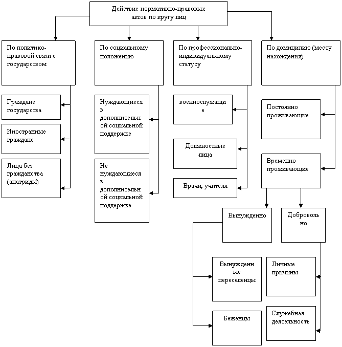 Действие НПА по кругу лиц в зависимости от понятийно-правовой связи с государством распространяется на: граждан государства, иностранных граждан, лиц без гражданства (апатриды), лиц с двойным гражданством (бипатриды), беженцы, граждан ближнего зарубежья, почетных граждан, лиц, обладающих дипломатическим иммунитетом и привилегиями.