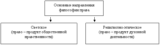 Религиозно-этические концепции рассматривали право как продукт духовной, идеальной деятельности. Основным фактором формирования права являлись высшие разумно-этические начала, которые представлялись в виде Абсолютной Идеи, Абсолютного Духа, Абсолютного Разума, Бога.