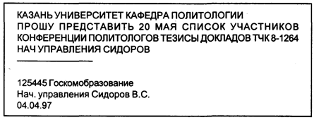 Эти элементы оформления обязательны при отправке документа как по почте, так и по факсу. Если документ оформлен неправильно или представлен не в полном комплекте, он возвращается исполнителю для доработки.