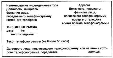 После передачи телефонограммы попросите записавшего повторно прочитать текст, чтобы убедиться в правильности записи. Фамилии и трудновоспринимаемые на слух слова передаются с разбивкой по буквам, допущенные ошибки исправляются. В организации может быть специальный бланк для телефонограмм, если они составляются часто. Но обычно они оформляются на чистом листе бумаги. Юридическая сила поступившей телефонограммы гарантируется реквизитами: исходящий регистрационный номер отправляемой телефонограммы, должность, фамилия, имя, отчество лица, отправившего телефонограмму, подпись лица, принявшего телефонограмму и входящим регистрационным номером полученной телефонограммы.