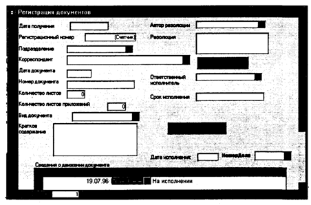 Наиболее рациональной является сегодня регистрация документов на компьютере. Но и в этом случае на экран выводится форма карточки (экранная форма РКК) с аналогичными полями и в нее заносятся сведения о документе.*