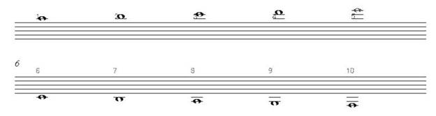 Натуральный (обертоновый) звукоряд от звука До большой октавы: