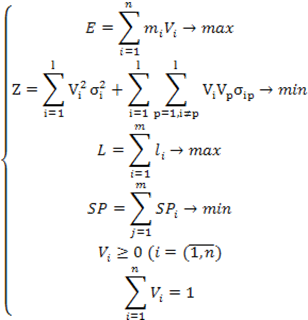 В результате применяя к результирующему портфелю критерии максимизации доходности, минимизации риска, максимизации ликвидности и минимизации кредитного риска получаем следующую математическую модель для решения задачи многокритериальной оптимизации инвестиционного портфеля: