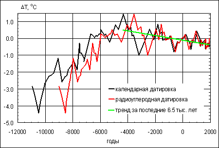 Отклонения средней годовой температуры (осреднение по 10-летиям) от современных значений для территории Русской равнины (обобщённые данные)