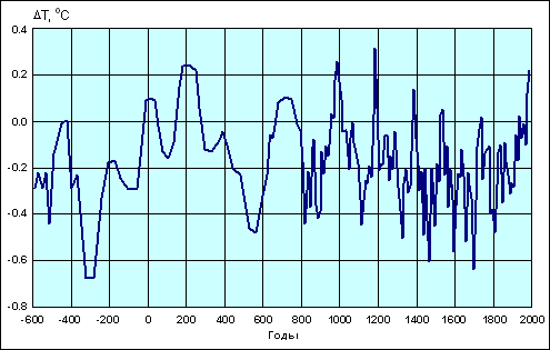 Это более подробная картина колебаний последних 2,5 тыс. лет. Естественно, она нам известна более хорошо. Здесь вы видите, что частота климатических колебаний выше, потому что начиная примерно с 800 г. мы уже в состоянии реконструировать среднедекадные, т. е. осредненные по десятилетиям температуры. Какие в это время происходили основные климатические события? Во-первых, это необычайный холод, по времени исторически совпадающий со временем ранней античности. Это явно неслучайное совпадение.