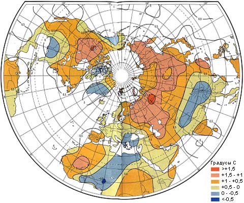 Вы видите, здесь есть красные и синие цвета, это картинка сверху северного полушария, и здесь разными цвета указано, насколько изменилась температура при среднеглобальном потеплении примерно на 0,5ºС. Чем интенсивнее коричневые и красные цвета — тем выше локальное повышение температуры. Там, где синий, там происходило похолодание на фоне глобального потепления. То есть не следует думать, что когда имеет место потепление, то теплеет у всех и одинаково — на самом деле совершенно по-разному. В частности, что здесь важно отметить? То, что эпицентром глобального потепления является Россия. На всей территории России региональное потепление выражено в 2-3 раза сильнее, чем в среднем по глобусу. Так что, если глобус теплеет на 1ºС, то Россия — на 2-3ºС.