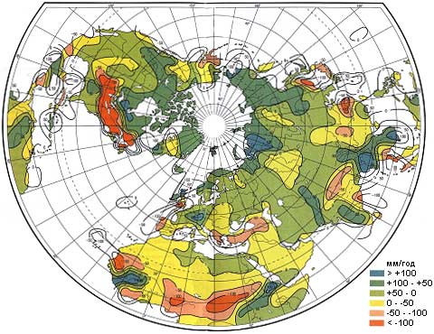 Отклонения среднегодовых сумм осадков (мм/год) в эпоху современного потепления (1980–1999 гг.) по сравнению с периодом (1911–1930 гг.)
