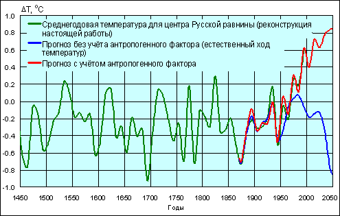 История и прогноз колебаний среднегодовой температуры на территории Русской равнины с учётом и без учёта влияния антропогенного фактора