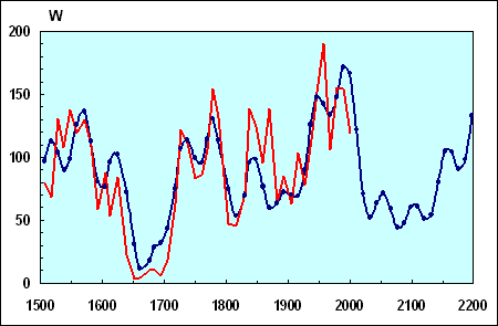 Здесь такая хвостатая кривая — это результаты инструментальных наблюдений с середины XIX в., когда у нас есть более-менее подробное представление о температуре по всему земному шару. А вот это — прогноз вашего покорного слуги на ближайшие 200 лет. Что видно из этого графика? В газетах вы прочтете, что повышение температуры с конца XIX в, когда, собственно говоря, и обозначилось повышение температуры, до нынешнего времени — это 0,5-0,6ºС, но это зависит от того, что с чем вы сравниваете. Если говорить о температуре последних пяти лет, то это уже 0,8ºС, потому что последняя пятилетка была очень теплой. Если сравнивать декадные или двадцатилетние значения, то это, действительно, будут 0,6-0,7ºС.