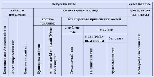 Нам представляется, что типология должна быть много-уровневой. Учитывая наличие следов обитания в гротах (Новгород-Северский и др.) для на-чала следует разделить жилища Русской равнины на искусственные сооружения и обустро-енные естественные убежища.