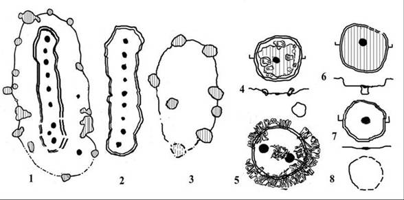 Рис.1. Типы жилищ верхнего палеолита Восточной Европы. 1-3 - Жилища-поселения. 4-8 - Элементарные жилища. 1 - Костенковско-Авдеевский (полный) тип. 2 - Александровский тип. 3 - Елисеевичский тип. 4 - Пушкаревский тип. 5 - Аносовско-Мезинский (Юдиновский) тип. 6 - Тельманский тип. 7 - Гмелинский тип. 8 - Чулатовский тип. Вертикальной штрихов-кой показаны углубленные объекты в пределах жилищ и жилищ-поселений.