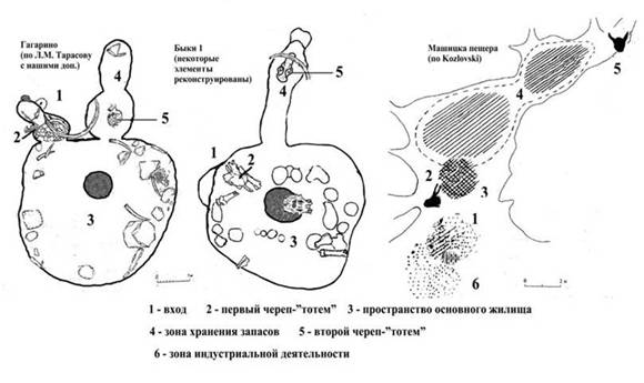 1. Основное жилище с тотемом. В Машицкой пещере это, соответственно, полость пещеры с тотемом в виде окрашенного черепа сайги у входа, со спальным пространством примерно для 15-20 человек. На стоянке Быки 1 - округлая полу-землянка с тотемом в виде черепа бизона над главным входом и со спальным пространством на 12-15 человек. В Гагарино - округлая полуземлянка с тотемом в виде черепа мамонта над главным входом и со спальным пространством на 12-15 человек.
