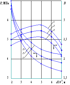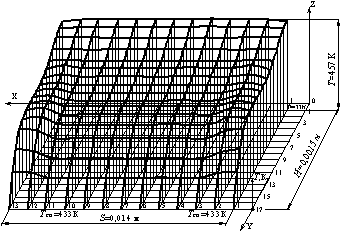 По виду графика (рис. 4) сделан вывод, что разогрев продукта в рабочей камере экструдера происходит гораздо быстрее с повышением угловой скорости вращения шнека. Последующее падение температуры обусловлено выходом экструдата из формующего канала матрицы. Увеличение начальной влажности смеси и ее температуры приводило к возрастанию скорости протекания процесса экструзии за счет снижения вязкости расплава в предматричной зоне. Распределение температуры продукта по длине экструдера (рис. 5) характеризуется ее резким возрастанием, начиная с зоны сжатия вплоть до предматричной области. В матрице она постоянна из-за небольшого отрезка времени нахождения в ней и при выходе продукта из формующего канала быстро понижается до 370…380 К за счет взрывного испарения воды и выделения значительного количества энергии. Причем с увеличением давления в предматричной зоне температура пищевой смеси несколько повышается. Начальная влажность пищевой среды по длине экструдера не изменяется (т. е. имеет постоянный вид за счет герметичности рабочей камеры экструдера и отсутствия зон дегазации) до попадания экструдата в зону атмосферного давления, где мгновенно испаряется примерно 10…20 % воды. Проанализированный характер изменения температуры и давления по времени и длине рабочей зоны позволил оценить влияние этих параметров на ход процесса экструзии, обосновать его рациональные режимы и получить рабочие характеристики одношнекового экструдера при оптимальных удельных расходах электроэнергии на производство палочек.