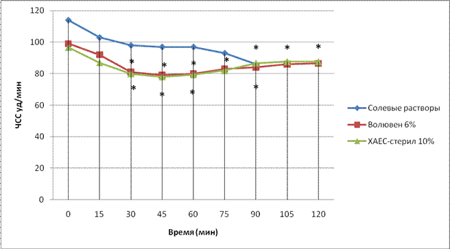 Динамика ЧСС на этапах исследования в зависимости от характера инфузионной терапии. (М+δ, n=10) (Рис.4)