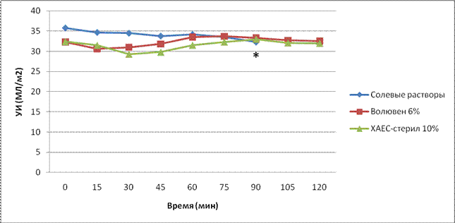 В третьей группе, где использовался ГЭК «ХАЕС-стерил 10%», было выявлено снижение импеданса туловища на всём протяжении исследования до 8,2% (9-й этап) по сравнению с исходом. С 60-й минуты течения анестезии снижение импеданса туловища было статистически достоверно (p<0,05).