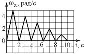10. Твердое тело начинает вращаться вокруг оси Z с угловой скоростью, проекция которой изменяется во времени, как показано на графике. В какой момент времени угол поворота тела относительно начального положения будет максимальным?