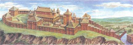 Замок расположен на крутом холме и обнесён деревянными стенами. Перед въездом – подъёмный мост через овраг. Стены состояли из срубов; одни из них были жилищами для воинов, а другие служили для кипячения «вара» - кипятка, которым обливали врагов во время осады. Большой участок был отведён под склады продовольствия и мёда. В трёх местах замка были подготовлены подземные ходы на случай опасности. В замке были четырёхэтажная башня, поварня, ямы – цистерны для воды и зерна. Гарнизон замка мог продержаться на своих запасах – около двух лет.