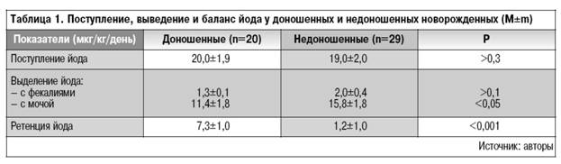 Проведенные F. Delange с соавторами в 1983 г. балансовые исследования на высоком методическом уровне впервые доказали, что 45% и более недоношенных новорожденных детей имеют разную степень отрицательного йодного баланса и выводят йода намного больше, чем потребляют (табл. 1).