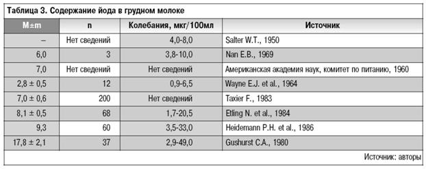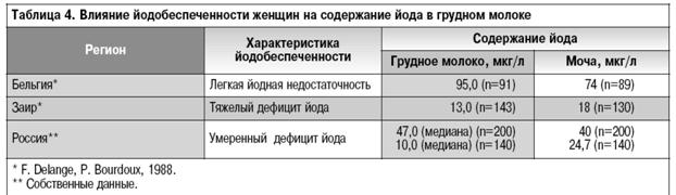Несмотря на важность обеспечения недоношенных детей адекватным количеством йода, нет окончательных рекомендаций по нормам его потребления в неонатальном периоде. Как известно, недоношенные новорожденные прежде всего нуждаются в полноценном грудном молоке. По данным зарубежных исследований и наших собственных наблюдений, содержание йода в грудном молоке отличается значительной вариабельностью (табл. 3) и зависит от обеспеченности беременной и лактирующей женщины йодом (табл. 4).