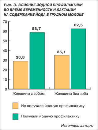 В этих условиях единственной возможностью улучшить йодобеспеченность новорожденных детей является назначение беременным и кормящим женщинам йодсодержащих препаратов. По нашим данным, прием физиологических доз йодсодержащих препаратов (100-150 мкг/день) беременными и кормящими женщинами достоверно увеличивает продолжительность лактации, в среднем до 5 месяцев (рис. 2) и повышает до нормы содержание йода в грудном молоке (рис. 3). Установлено, что сроки нормализации состава грудного молока зависят от степени выраженности у матери йододефицитных заболеваний и длительности профилактики и коррекции.