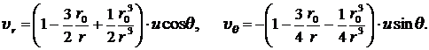 скорости движения индивидуальной частицу при медленном обтекания шара потоком вязкой несжимаемой жидкости определяются соотношениями: