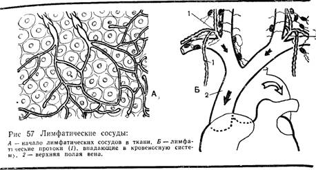 Тканевая жидкость и лимфа. Находясь в кровеносных сосудах, кровь непосредственно не соприкасается с клетками органов и тканей. Тонкая стенка капилляров, состоящая из одного слоя плоских клеток, отделяет кровь от тканевой жидкости, находящейся в межклеточных щелях и промежутках. Эту жидкость называют внутренней средой организма, так как она непосредственно соприкасается с клетками. Клетки поглощают из нее кислород и питательные вещества и отдают в нее углекислоту и другие продукты обмена веществ. На долю тканевой жидкости приходится около 50% веса тела. По своему составу она отличается от крови; в ней, например, почти нет белков, тогда как кровь содержит их около 7%. Избыток тканевой жидкости поступает в особые сосуды, которые называются лимфатическими (рис. 57). Они обычно начинаются в тканях в виде слепых мешочков и образуют густую сеть. Начальные лимфатические сосуды, соединяясь друг с другом, образуют все более крупные сосуды. Находящаяся в них жидкость — лимфа — в конце концов по двум лимфатическим протокам впадает в крупные вены большого круга кровообращения, недалеко от сердца.