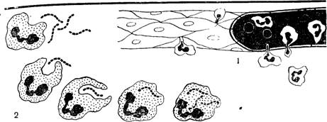 ; — схема выхождения лейкоцитов из кровеносного сосуда; 2 — последовательные стадии захватывания микробов.