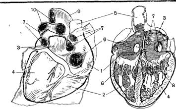 /—правое предсердие; 2—правый желудочек i — левое пред сердие 4 — левый желудочек 5 -— верхняя полая ве на 6— просвет нижней по юн ве ны, 1 — легочные вены в—кчапа ны между предсердиями и желудочками, 9 — аорта 10'— правая и левая легочные артерии.