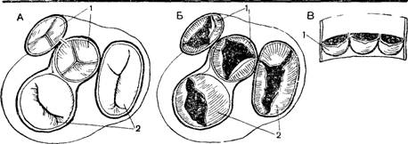 ;— полулунные клапаны в аорте и легочной аргерии, 3 — створчатые клапаны между пред сердием и желудочком