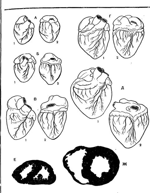 Л — новорожденного; Б — трехмесячного; Д—годовалого; Г — двухлетнего; Д ~ пятилетнего; Е — среэ сердца новорожденного; Ж. — срез сердца шестилетнего;