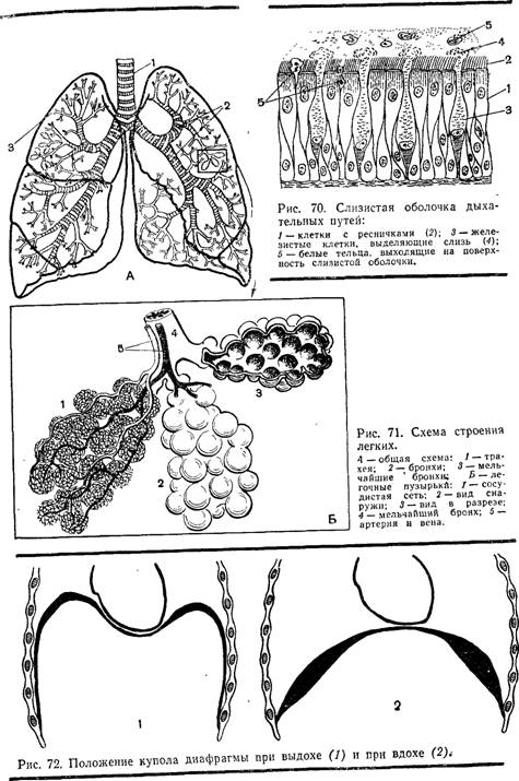 От нижнего ксцш-а-гпря'|Ин>-етголит т. рахе^. Она делится на два бронха, которые входят в правое и левое легкие (рис. 70, Л). В легких. бронхи многократно ветвятся. Хрящевые полукольца, расположенные в стенках трахеи и бронхов, делают их упругими и не-сппдающимися, а тем самым — легкопроходимыми для воздуха.