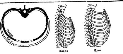 Рис. 73. Схема изменения объема грудной клетки при вдохе и выдохе.