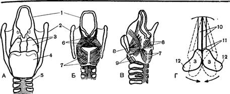 А—хрящи гортани (сзади); Б и В—мышцы (спереди и сбоку); /"—схема действия мышцы, раскрывающей голосовую щель; / — надгортанник. 2 — щитовидный хрящ, 3 — черпало-видные хрящи, 4—перстневидный хрящ, 5—трахея; 6—9 мышцы, суживающие голосовую щель (6), раскрывающие ее (7), расслабляющие голосовые связки и суживающие голосовую щель (S), натягивающие голосовые связки и суживающие голосовую щель (9), /О—голосовые связки, // — голосовой отросток черпаловидного хряща, 12 — мышечный отросток, стрелки — направление тяги при сокращении мышц; прерывистые линии показывают перемещение черпаловидных хрящей и раскрытие голосовой щели ___