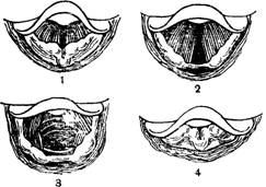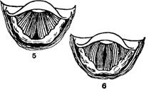 /—при произнесении звука; 2-—при вдохе; S—при глубоком вдохе (в глубине видно давление трахеи на два бронха); 4—рефлекторное закрытие голосовой щели при поднесении к носу сильно пахнущего вещества; 5 — при шепоте; S — при пеняй фальцетом.