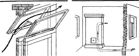Фрамуги всегда делают в верхней части окна. При открывании их'создается большая разница наружной и внутренней температур, что увеличивает скорость движения воздуха и объем проветривания по сравнению с проветриванием через форточки, расположенные, как правило, в средней или нижней части окна. Воздух, проникающий через фрамугу, опускаясь вниз в силу большего удельного веса, проходит через теплые слои комнатного воздуха, отнимает у них часть тепла и успевает несколько нагреться. Это позволяет в осенние и ранние весенние месяцы, а частично и зимой держать фрамуги открытыми в присутствии детей.