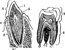 /—зубная эмаль, 2—дентин, S—каналы» по которым сосуды и нервы входят в полость зуба (4), о—коронка; 6—корень.