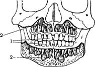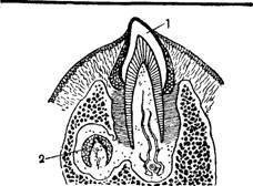 Рис. 83. Прорезывание молочного зу* ба (1); сбоку виден зачаток постоянного зуба (2).