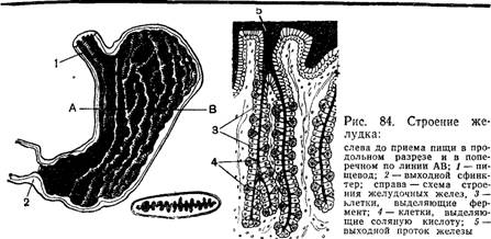 Желудок человека (рис. 84), растягиваясь, может вмещать 2—3 л воды. В его стенке находится толстый слой мышечных волокон. При их сокращении объем желудка. значительно уменьшается Слизистая оболочка желудка образует многочисленные складки. что способствует лучшему соприкосновению пищи со стенками желудка. При растяжении желудка складки расправляются.