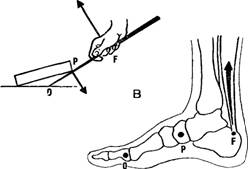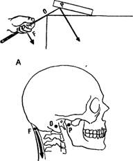 О—точка опоры, F—точка приложения силы (место прикрепления мышцы); Р — точка приложения противодействия Для сравнения показана схема поднятия крышки палкой при подобном же расположении