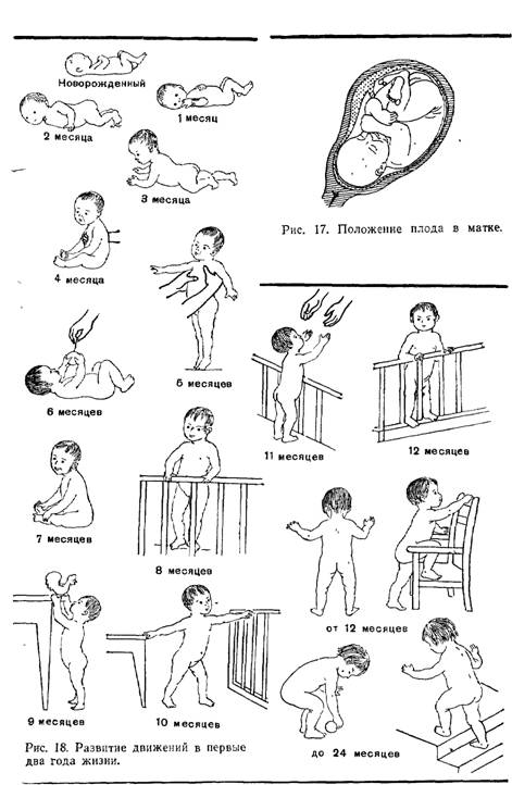 Способность мышц сокращаться появляется еще раньше — уже к концу второго месяца внутриутробной жизни. Постепенно развивается мышечный тонус, причем в период внутриутробного развития и в грудном возрасте тонус мышц сгибателей преобладает над тонусом мышц разгибателей, что имеет значение для сохранения естественного положения тела в матке (рис. 17).