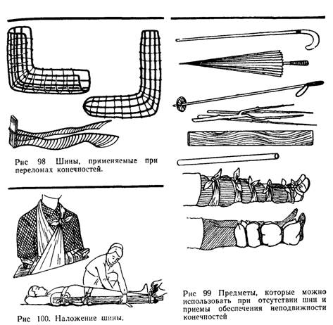Переломы. При переломе кости наблюдается резкая боль, усиливающаяся при малейшем движении, подвижность кости в том месте, где нет сустава, изменение внешней формы сломанной конечности (ненормальные выступы, искривления). Первая помощь сводится к обеспечению полного покоя для предупреждения смещения обломков, которые могут поранить окружающие ткани (мышцы, сосуды, нервы) и вызвать еще большую боль. При переломах руки или ноги для обеспечения неподвижности применяются шины (рис. 98). Если их нет под рукой, можно воспользоваться палкой, зонтом, пучком прутьев и т. д. В крайнем случае сломанную руку можно прибинтовать к грудной клетке, ногу — к здоровой ноге (рис. 99). Под шину обязательно надо подложить вату, марлю или просто какое-либо белье или ткань, а потом уж плотно прибинтовать ее к конечности. Шина должна захватывать два сустава: один выше, другой ниже перелома (рис. 100). Для предупреждения отека шину прибинтовывают к поврежденной конечности, начиная от пальцев кверху.