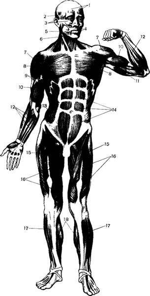 Таблица III Мышцы человека спереди /—лобная, собирающая кожу лба в поперечные складки, 2—височная, 3—круговая глаза, закрывающая глаз, 4 — круговая рта, закрывающая рот, 5 — жевательная (участвует в жевательных движениях), 6 — грудино ключично сосцевидная "7при ее сокращении с обеих сторон голова наклоняется книзу, при сокращении с одной стороны — поворачивается в противоположную сторону, наклоняясь в сторону сократившейся мышцы), 7 — дельтовидная (поднимает руку), 8—большая грудная (опускает руку, приводя ее вперед, при неподвижной руке поднимает грудную клетку), 3 — зубчатая (при усиленном вдохе поднимает грудную клетку), 10—двухглавая (сгибает руку в локте), //—трехглавая (разгибает руку в локте), 12 — сгибатели кисти и пальцев, 13 — косая брюшная (наклоняет туловище вперед и поворачивает в сторону), 14—прямая брюшная, сгибающая туловище вперед и опускающая грудную клетку, 15 — портняжная (сгибает ногу в колене и поворачивает голень внутрь, 16 — четырехглавый разгибатель бедра, /7 — передняя большеберцовая (разгибает голеностопный сустав), 18 — икроножная (сгибает голеностопный сустав), опуская переднюю и поднимая заднюю часть стопы, производит поднимание тела на носки)
