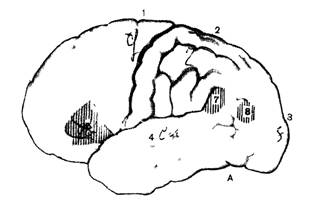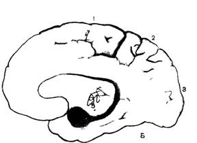 Таблица VII Локализация функций в коре больших полушарий А — наружная поверхность левого полушария, Б — внутренняя поверхнос шария / — двигательный центр, 2 — центры кожной чувствитечьности ) 4 — центры слуха. 5 — центры обоняния и вкуса, заштрихован»] it ut и течьный (б), слуховой (7), зрительный (в)