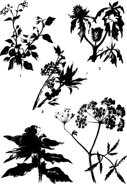 I - паслен, 2 - дурман, 3 - волчье лыко, 4 - белена, 5 - собачья петрушка