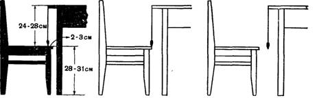 Чтобы ребенок мог опираться спиной о спинку стула, дистанция спинки (расстояние между спинкой и краем стола, обращенным к сидящему) должна на 3—5 см превышать передне-задний диаметр грудной клетки. При этом расстояние между отвесными линиями, опущенными от переднего края стула и от заднего края стола, или дистанция сиденья, становится «отрицательной», а именно край стула на 2—4 см заходит под край стола (рис. 23). При нулевой дистанции сиденья, когда край стула и край стола находятся на одной отвесной линии, а также при положительной дистанции сиденья, когда стул несколько отодвинут от края стола, опираться на спинку стула при выполнении какой-либо работы за столом невозможно.
