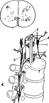вверху — поперечный разрез спинного моз га, внизу—спинной мозг в почвоночном канале / — передние корешки нервов 2 — задние корешки", 3 — пограничный симпатический ствол.