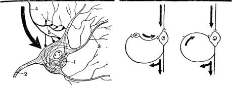 Рефлекторные дуги. Простейшие рефлекторные дуги состоят из двух или тре-х нейронов (цв. табл. IX). Примером двухнейронной дуги может служить дуга коленного рефлекса. Если человека посадить на стул, предложив ему закинуть одну ногу на другую, а затем ударить ребром ладони или лучше легким молоточком по сухожилию ниже коленной чашечки, то нога подскакивает. Сухожилие, подвергшееся удару, прогибается и тянет за собой мышцу, разгибающую ногу в колене. Мышца растягивается, что вызывает раздражение находящихся в ней рецепторов. Возникающий при этом поток импульсов по афферентным нейронам доходит до спинного мозга, а оттуда по эфферентным возвращается к той же самой мышце, вызывая ее ответное укорочение (цв. табл. IX).