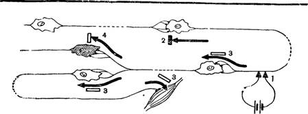 3 — переход возбуждения на следующий нейрон или на мышцу; 4 — торможение.