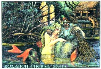 Над образом русалки работал (эскиз 1880-хгг.). Близка народно-поэтическому «Русалка» И. Билибина (1934), сопровождаемая собственноручной подписью художника: «Русалка парней завлекает и топит».