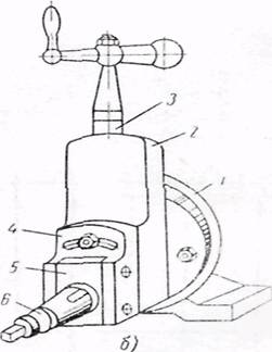 На рисунке 2 а) показан общий вид поперечно – строгального станка. В верхних направляющих станины 1 смонтирован ползун 2, совершающий с помощью кулисного механизма возвратно – поступательное перемещение (главное движение). На левом конце ползуна укреплен суппорт 3. Он состоит из поворотного диска 1 показанных на рисунке 2 б) и салазок 2, получающих периодически вертикальную подачу от ходового винта 3. На салазках смонтирована резцовая каретка 4 с откидной планкой 5 и резцедержателем 6.
